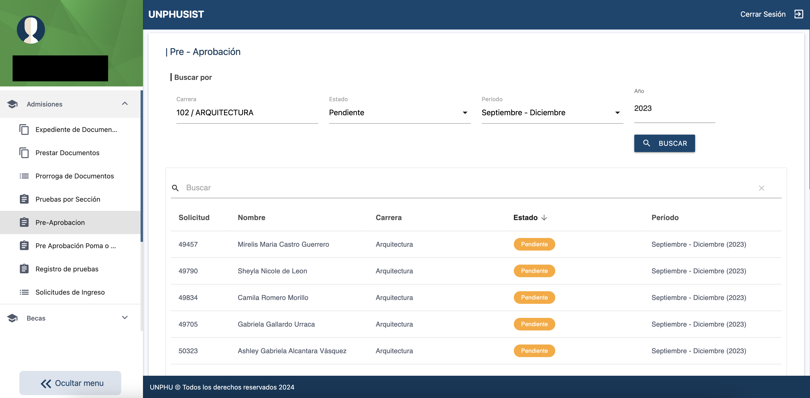 Al aplicar estos filtros, el sistema muestra una lista de los solicitantes que deben ser revisados.